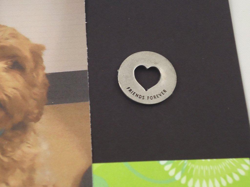 For this adorable page I wanted to really focus on the picture of the dogs but added a few tokens from www.CourageInStone.com to make the page really “talk” to you. I chose the 3 inspiration coins (Frog-Smile #6471, Bee-Happy #6475, & Flower-Joy #6534) and used only the word side of the coin to add some interesting emotions to this page. Then I used the Friendship Blessing Coin (# 3628mm ) which has “Friends Forever” on the reverse side as a final touch.