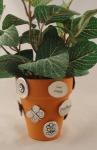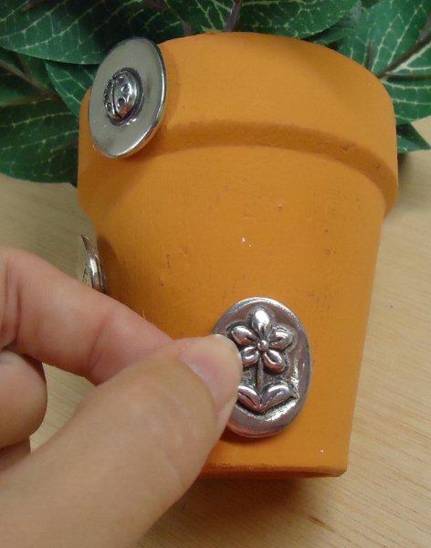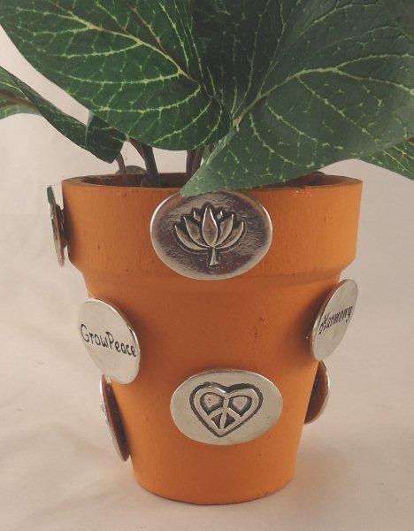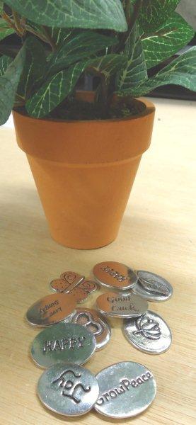 I chose Inspiration Coins with the sayings like ‘Happy‘, ‘Harmony‘, & ‘Live Simply‘. I also used coins picturing a butterfly, bee, and flowers. Glue these on in your own creative design and your unique flower pot is ready for use.