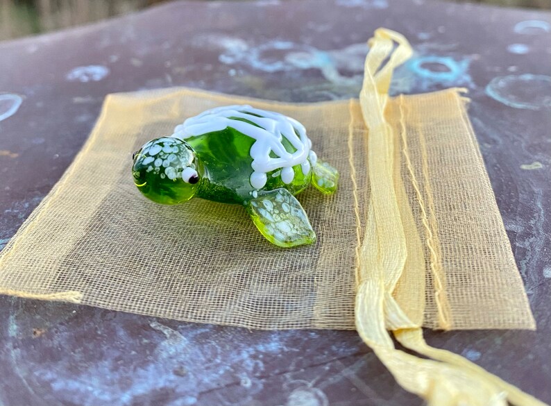 Adorable miniature turtle figurine measures 1 1/2″ x 1 1/4″. Comes in a small organza gift bag.